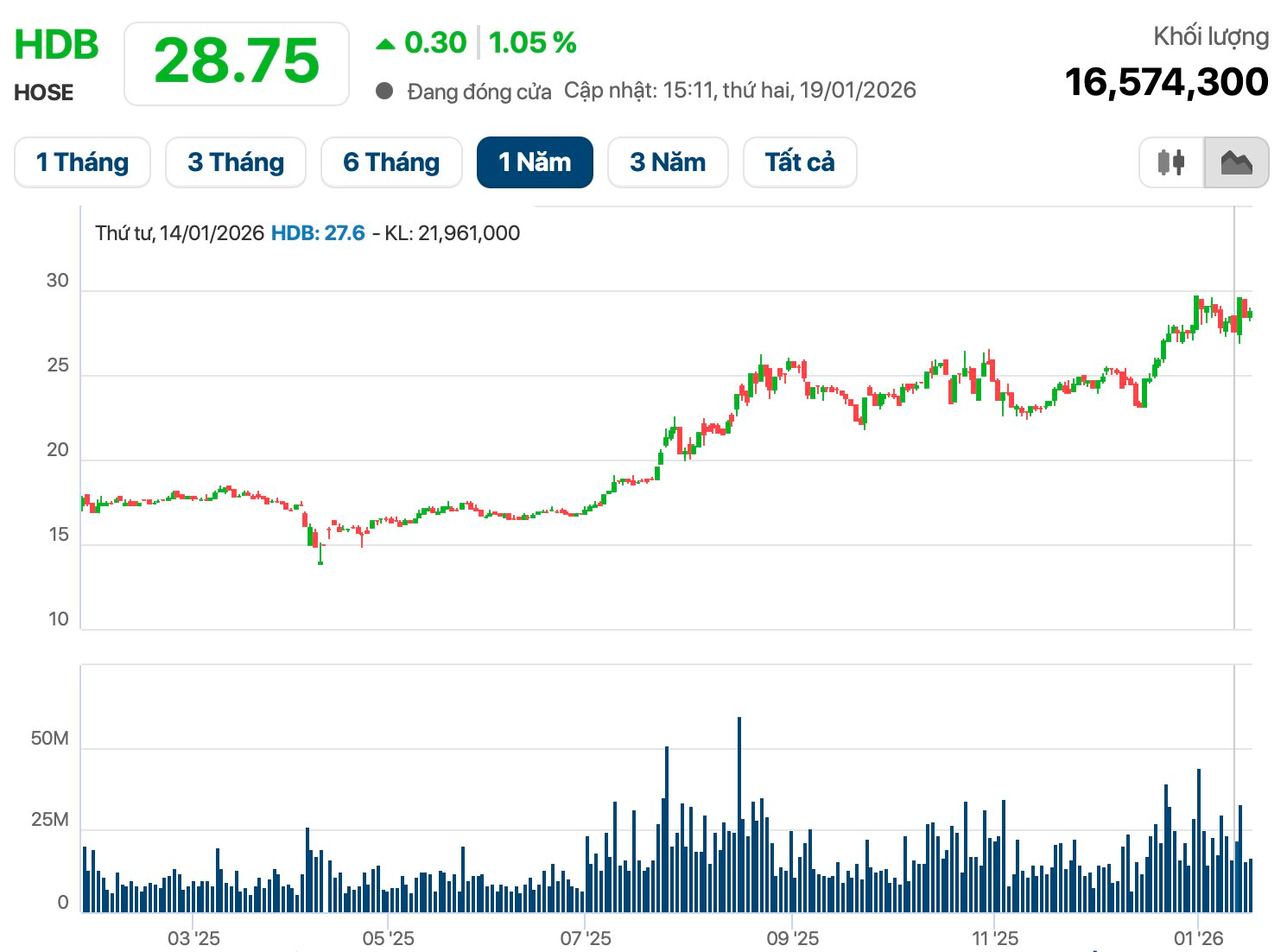 Thoả thuận đột biến tại HDBank diễn ra trong bối cảnh cổ phiếu HDB đang ở gần vùng đỉnh lịch sử sau khi tăng hơn 65% trong 1 năm trở lại đây. Tạm tính tại mức thị giá hiện tại (28.750 đồng/cp), vốn hóa thị trường của HDBank đạt xấp xỉ 144.000 tỷ đồng.