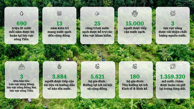 Trong tổng lượng nước được bù hoàn, hơn 559 triệu lít đến từ chương trình bảo tồn lưu vực sông và khoảng 131 triệu lít từ các dự án nước sạch cộng đồng. Riêng tại khu bảo tồn sinh thái Đồng Tháp Mười, dự án đã giúp bổ sung hơn 521.000 m³ nước mỗi năm, đồng thời trồng mới hàng chục hecta rừng tràm và cây bản địa, giúp đất giữ ẩm, ngăn xói mòn và phục hồi sinh cảnh tự nhiên.