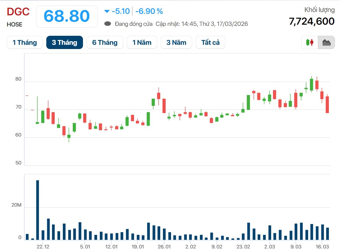 Sau khi thông tin này được công bố, cổ hiếu DGC của Tập đoàn Hóa chất Đức Giang giảm kịch sàn xuống 68.800 đồng/cp, với dư bán sàn gần 12,6 triệu đơn vị trong ngày 17/3.