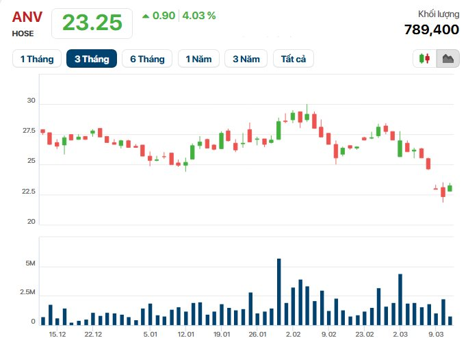 Tương tự, việc cổ phiếu ANV lùi về vùng giá thấp cũng thúc đẩy Phó Tổng giám đốc Doãn Chí Thiên, con trai Tổng giám đốc Nam Việt, chi khoảng 23 tỷ đồng mua 1 triệu đơn vị. Chốt phiên sáng 11/3, mã ANV đang giao dịch ở mức 23.250 đồng.