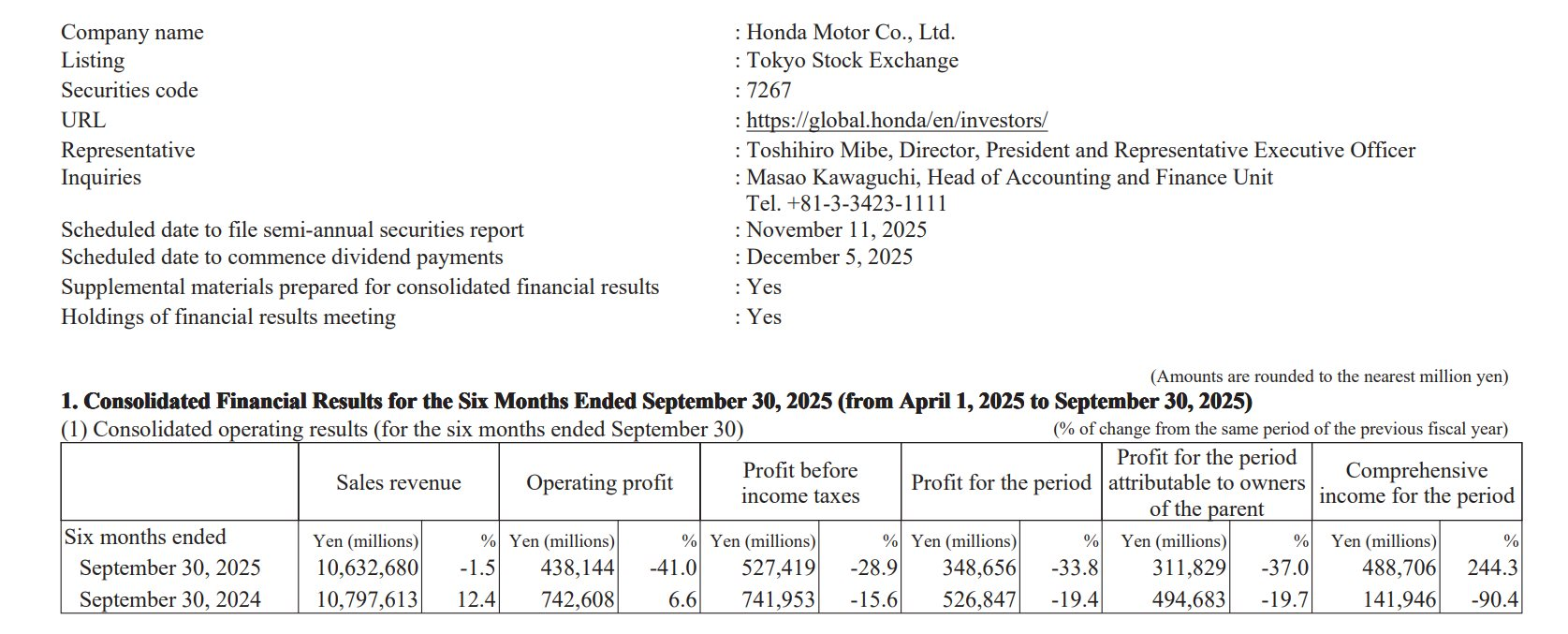 Honda cho biết doanh thu trong 6 tháng này là 10.633 tỷ yên, giảm 1,5% so với cùng kỳ. Lợi nhuận trước thuế là 527,4 tỷ yên, giảm 28,9%; còn lợi nhuận sau thuế là 348,7 tỷ yên, giảm 33,8%.