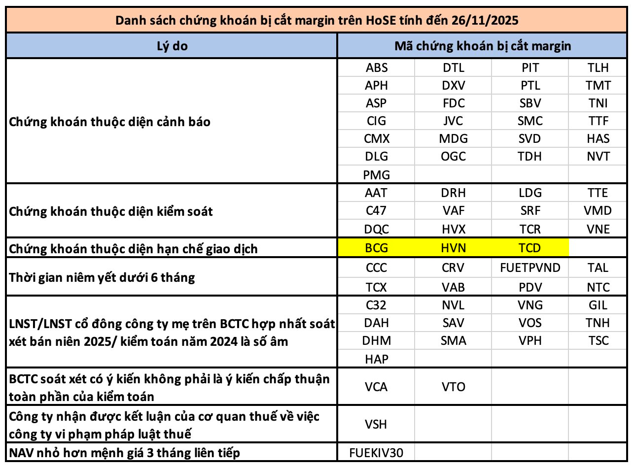 HOSE vừa cập nhật danh sách chứng khoán không đủ điều kiện giao dịch ký quỹ (margin). Tính đến ngày 26/11/2025, số lượng cổ phiếu bị cắt margin trên HoSE là 65 mã.
