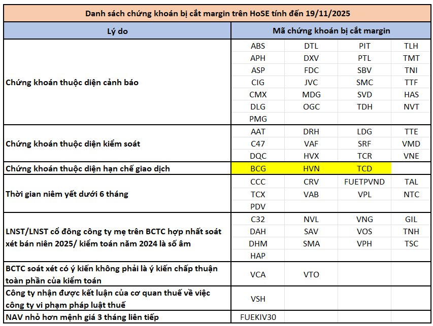 HOSE vừa cập nhật danh sách chứng khoán không đủ điều kiện giao dịch ký quỹ (margin). Tính đến ngày 19/11/2025, số lượng cổ phiếu bị cắt margin trên HoSE là 66 mã.