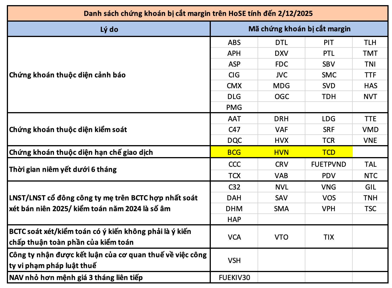 Tính đến 2/12/2025, danh sách bổ sung chứng khoán không đủ điều kiện giao dịch ký quỹ gồm 66 mã. Các nguyên nhân được HOSE đưa ra bao gồm chứng khoán thuộc diện cảnh báo/kiểm soát/hạn chế giao dịch; lợi nhuận sau thuế là số âm, báo cáo kiểm toán có ý kiến của đơn vị kiểm toán; thời gian niêm yết dưới 6 tháng…