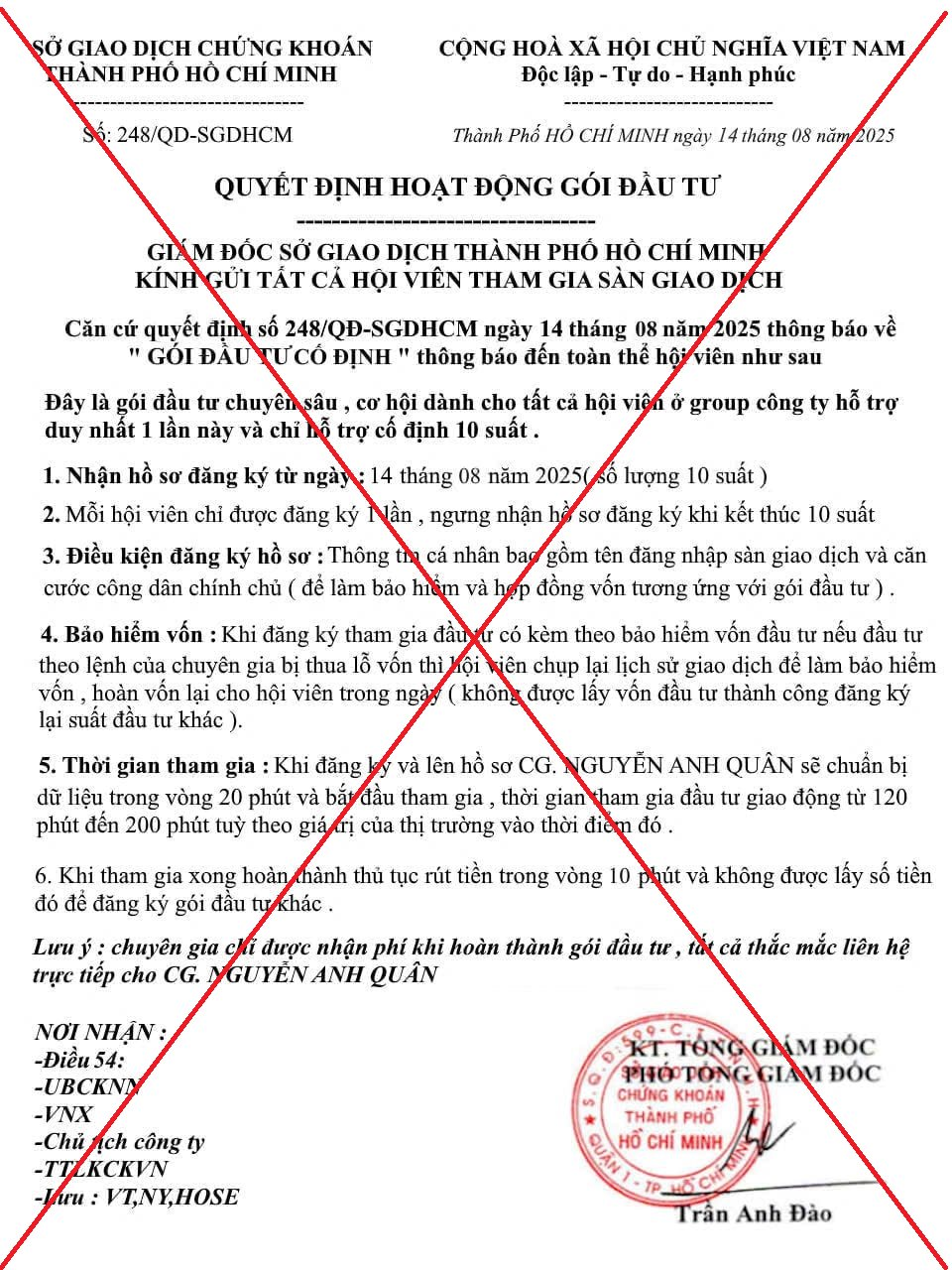 HOSE khẳng định hình ảnh thông tin trên là không đúng và đã bị giả mạo. HOSE cảnh báo nhà đầu tư cần nâng cao cảnh giác trước các thông tin không xác thực, đặc biệt là các hình ảnh tài liệu mạo danh HOSE như “Quyết định hoạt động gói đầu tư”, “hợp đồng hợp tác đầu tư” các tài liệu, văn bản sử dụng hình ảnh con dấu và chữ ký giả mạo HOSE.