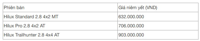 Tại thị trường Việt Nam, Toyota Hilux 2026 được phân phối với các phiên bản chính cùng mức giá cực kỳ cạnh tranh:
