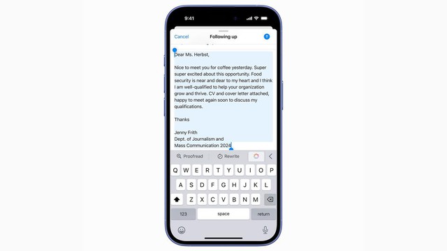Writing Tools trên iPhone 16 cho phép hiệu đính, tóm tắt và chuyển đổi văn phong email chuyên nghiệp chỉ trong vài giây mà không cần chuyển ứng dụng.