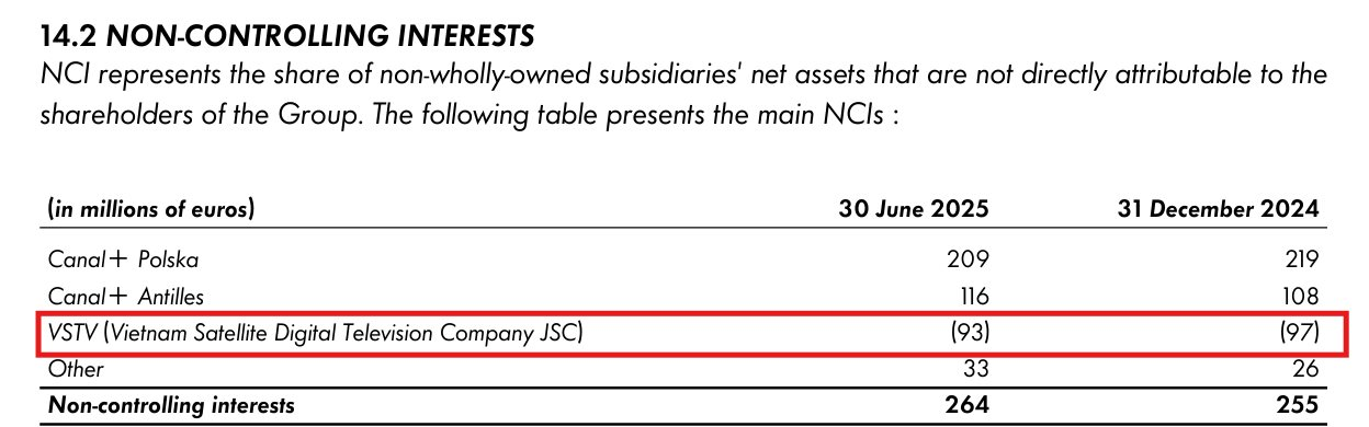 Báo cáo bán niên 2025 của Canal+ cũng cho thấy hoạt động tại Việt Nam đang bị "ảnh hưởng đáng kể bởi biến động thị trường" và VSTV vẫn đang ghi nhận khoản lỗ lũy kế thuộc về cổ đông mà Canal+ không kiểm soát (Non-controlling interests, NCI) là âm 93 triệu Euro (khoảng 2.800 tỷ đồng) tính đến 30/06/2025, thu hẹp từ 97 triệu Euro tại thời điểm cuối năm 2024.