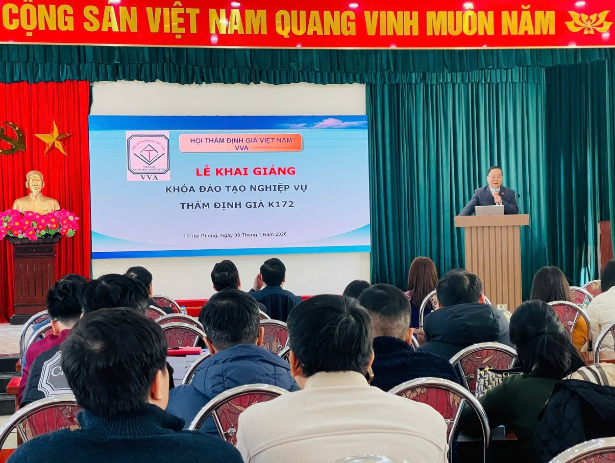 Sáng 9/1, tại TP. Hải Phòng, Hội Thẩm định giá Việt Nam phối hợp với Công ty CP Tư vấn Thẩm định giá VCHP tổ chức khai giảng khóa đào tạo nghiệp vụ thẩm định giá K172, nhằm bồi dưỡng và nâng cao kiến thức chuyên môn, kỹ năng nghề nghiệp cho đội ngũ thẩm định viên, cùng cán bộ, công chức, viên chức và các học viên quan tâm.