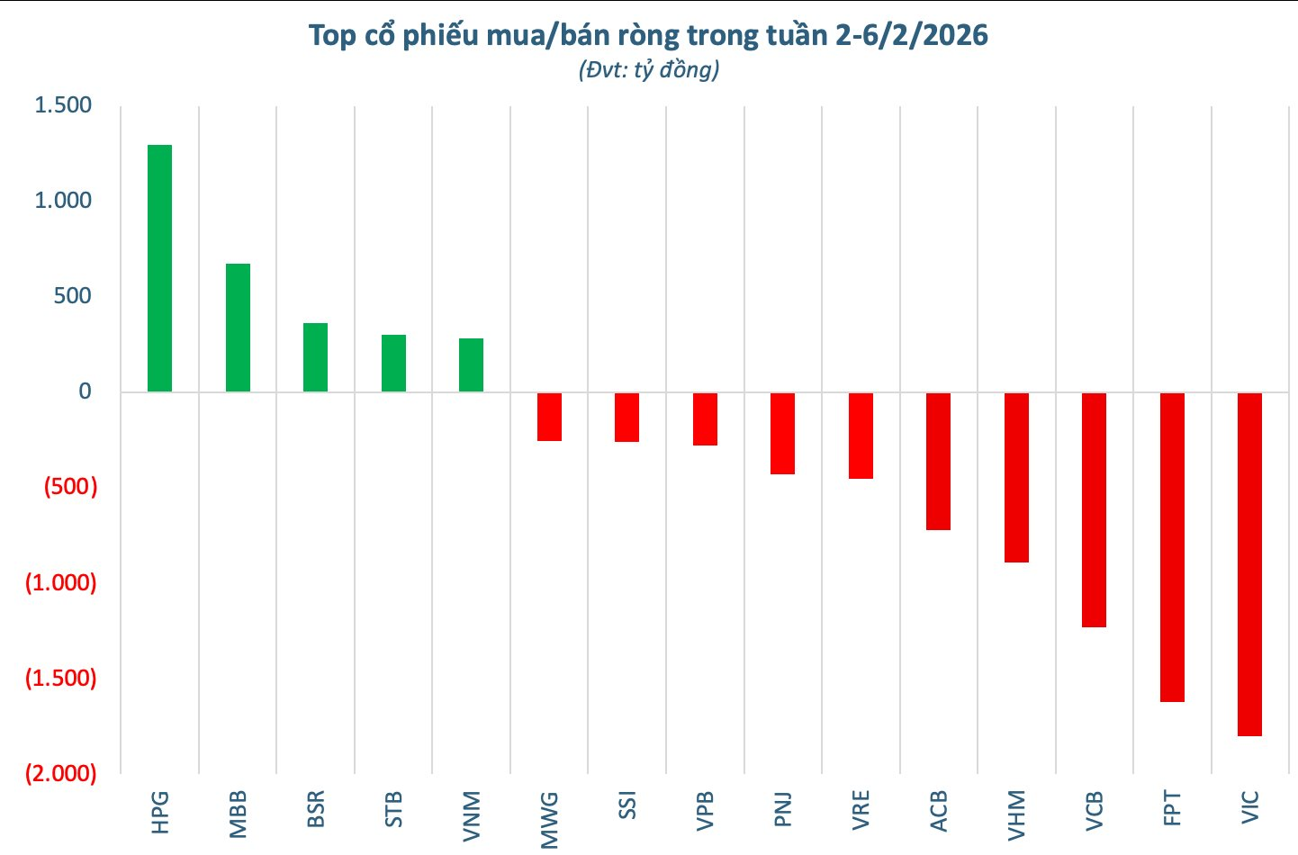 Thống kê giao dịch của khối ngoại cho thấy dòng tiền có sự phân hóa mạnh giữa các nhóm cổ phiếu. Ở chiều mua ròng, HPG nổi bật tuyệt đối với giá trị lên tới 1.297 tỷ đồng, trở thành tâm điểm hút vốn ngoại trong phiên. Theo sau là MBB (673 tỷ đồng) và BSR (363 tỷ đồng). Một số mã quen thuộc khác cũng được gom tích cực gồm STB (304 tỷ đồng) và VNM (284 tỷ đồng).