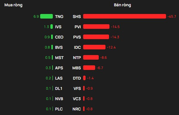 Chiều ngược lại, SHS là mã chịu áp lực bán ròng của khối ngoại với giá trị gần 46 tỷ đồng; theo sau PVI bị bán 15 tỷ, PVS, IDC, NTP bị bán từ vài tỷ đồng.