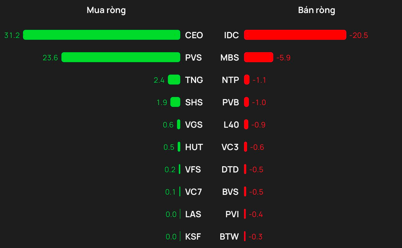 Tại chiều mua, CEO được mua ròng mạnh nhất với giá trị 31 tỷ đồng. Bên cạnh đó, PVS xếp tiếp theo trong sách mua ròng mạnh trên HNX với 24 tỷ đồng. Ngoài ra, khối ngoại cũng chi vài tỷ đồng để gom ròng TNG, SHS, VGS.