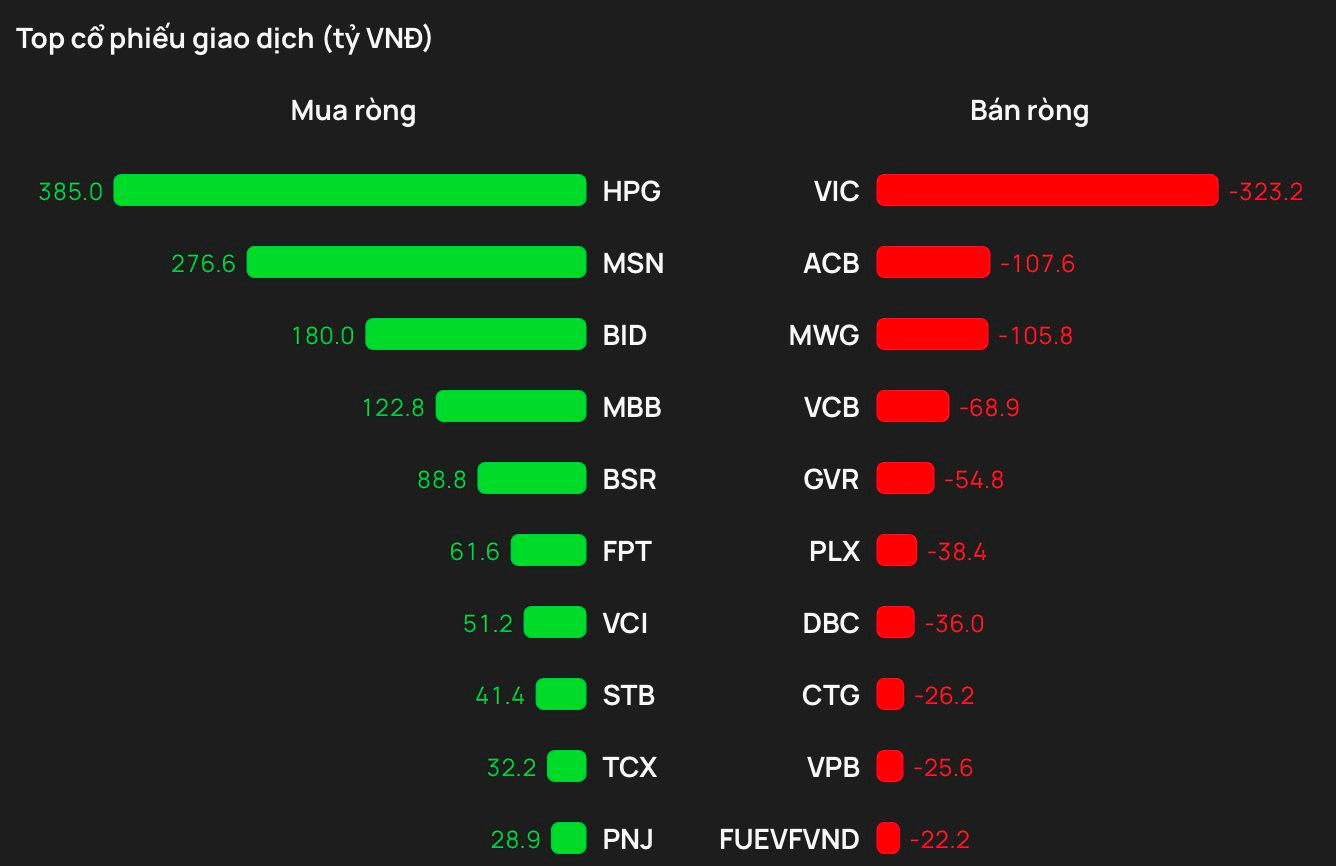 Tại chiều mua, cổ phiếu HPG được khối ngoại mua mạnh nhất trên HOSE với giá trị hơn 385 tỷ đồng. Theo sau, MSN và BID là mã tiếp theo được gom mạnh 277 tỷ đồng và 180tỷ đồng.