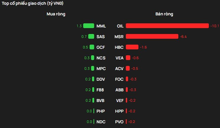 Ngược chiều, OIL bị khối ngoại bán ròng 10 tỷ đồng. Ngoài ra khối ngoại cũng bán ròng tại MSR, HBC,...