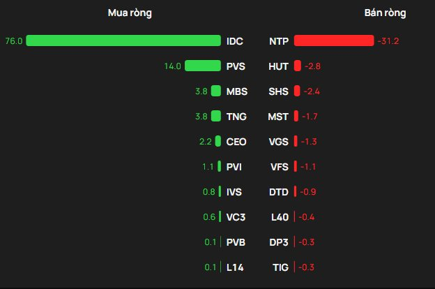Tại chiều mua, IDC được mua ròng mạnh nhất với giá trị 76 tỷ đồng. Bên cạnh đó, PVS xếp tiếp theo trong sách mua ròng mạnh trên HNX với 14 tỷ đồng. Ngoài ra, khối ngoại cũng chi vài tỷ đồng để gom ròng MBS, TNG, CEO.