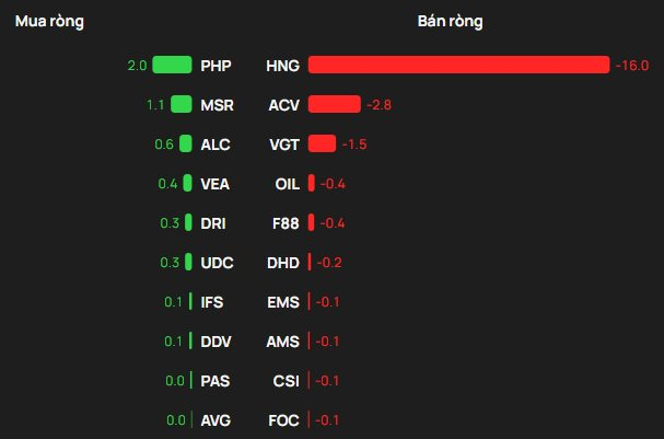 Ngược chiều, HNG bị khối ngoại bán ròng 16 tỷ đồng. Ngoài ra khối ngoại cũng bán ròng tại ACV, VGT,...
