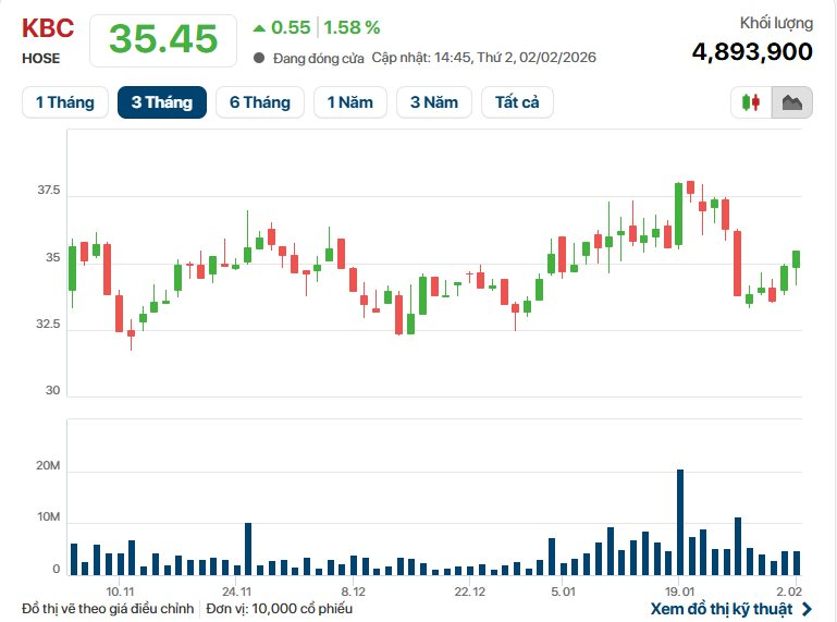 Trên thị trường chứng khoán, cổ phiếu KBC tăng lên mức 35.450 đồng/cp.