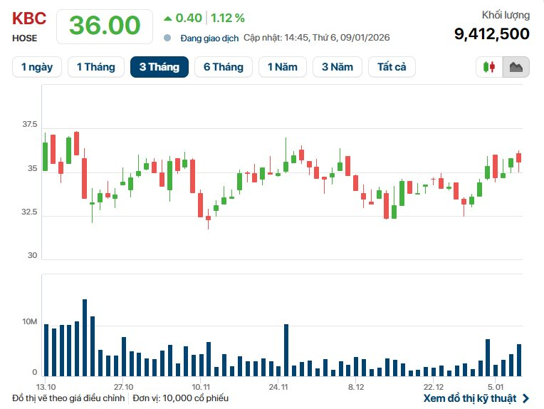Đóng cửa phiên giao dịch ngày 9/1, cổ phiếu KBC có giá 36.000 đồng/cp, vốn hóa thị trường đạt 33.900 tỷ đồng.