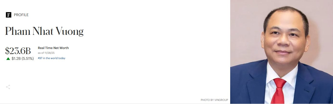 Hiệu ứng từ đà tăng phi mã này cũng ngay lập tức phản ánh vào giá trị tài sản ròng của Chủ tịch HĐQT Phạm Nhật Vượng. Theo dữ liệu thời gian thực từ Forbes cập nhật ngày 28/11/2025, khối tài sản của ông Vượng đã vọt lên mức 23,6 tỷ USD, tăng tới 1,2 tỷ USD chỉ trong một phiên giao dịch. Thành tích ấn tượng này đã đưa người đứng đầu Vingroup thăng hạng mạnh mẽ, chính thức lọt Top 97 người giàu nhất hành tinh, xác lập một kỷ lục mới về tài sản cá nhân của một doanh nhân Việt Nam.