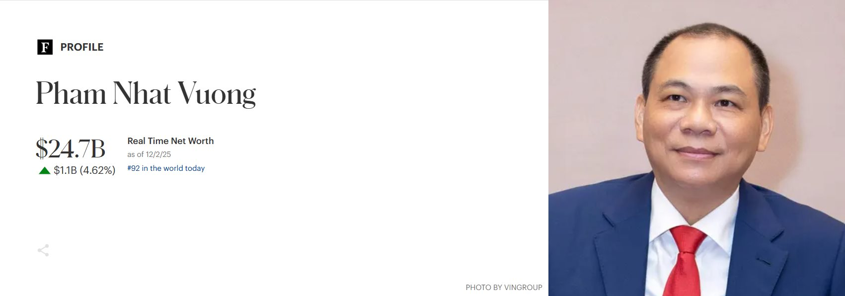 Theo bảng xếp hạng Forbes, ông Phạm Nhật Vượng đang sở hữu khối tài sản 24,7 tỷ USD, là người giàu thứ 92 trên thế giới.