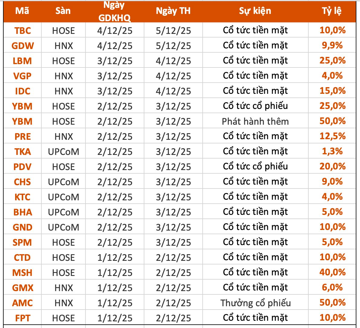 Theo thống kê, có 20 doanh nghiệp thông báo chốt quyền cổ tức trong tuần 1/12– 5/12. Trong đó, 16 doanh nghiệp trả cổ tức bằng tiền mặt trong tuần này, mức cao nhất là 40% và thấp nhất là 1,3%.