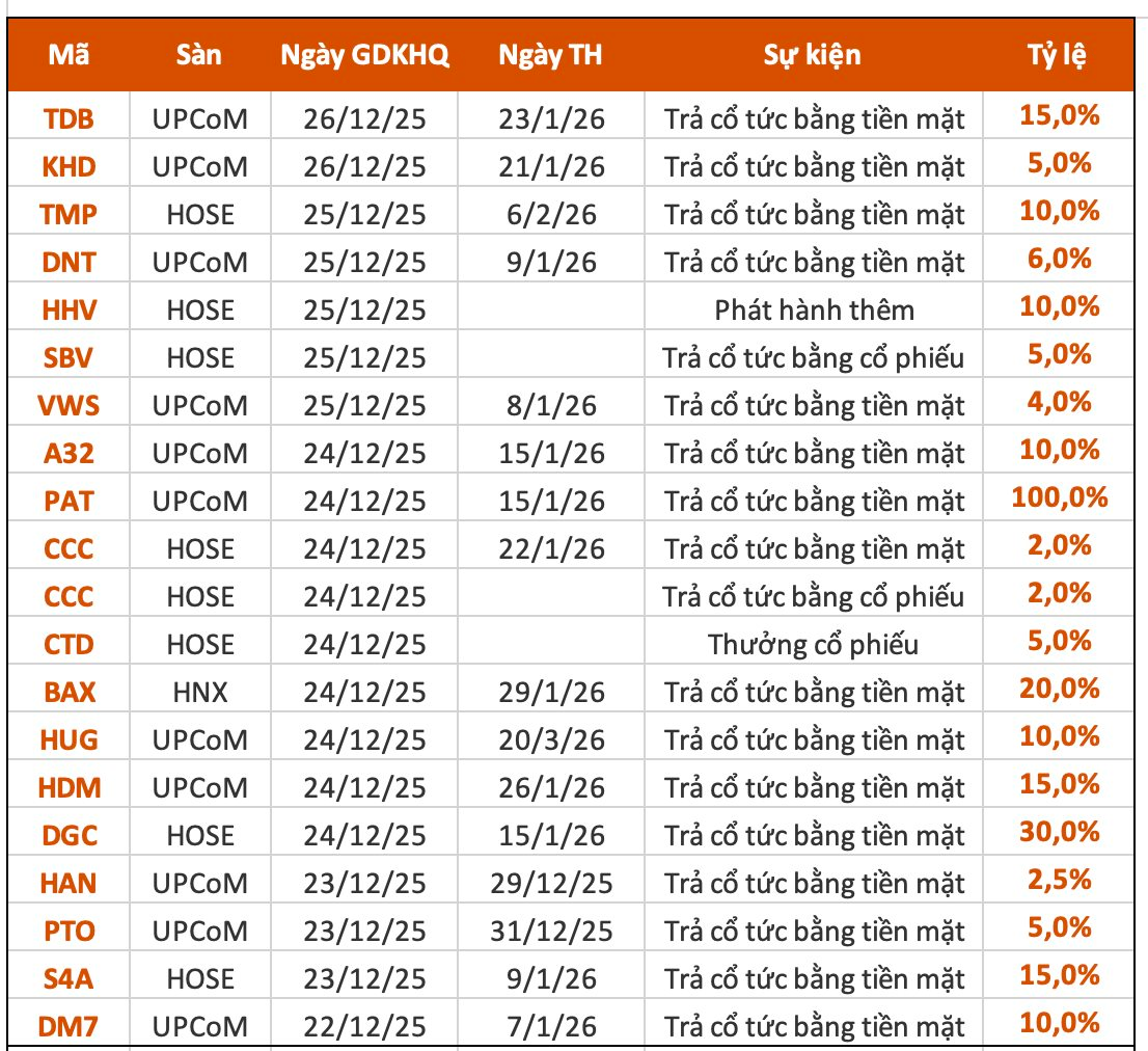 Theo thống kê, có 20 doanh nghiệp thông báo chốt quyền cổ tức trong tuần 22/12– 26/12. Trong đó, 16 doanh nghiệp trả cổ tức bằng tiền mặt trong tuần này, mức cao nhất là 100% và thấp nhất là 2%.