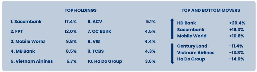 Trong tháng 12, bộ đôi cổ phiếu ngân hàng HDB và STB đã lần lượt tăng 20% và 19%, qua đó đóng góp lớn vào hiệu suất của quỹ. Quỹ cho biết thêm mã Sacombank (STB) tháng qua đã đón nhận thông tin mang tính “xúc tác” liên quan tới lãnh đạo thượng tầng, được giới đầu tư đánh giá là tín hiệu cho thấy ngân hàng đang tiến gần đến chặng cuối của quá trình tái cơ cấu kéo dài nhiều năm, qua đó từng bước mở ra dư địa hiện thực hóa giá trị trong thời gian tới.
