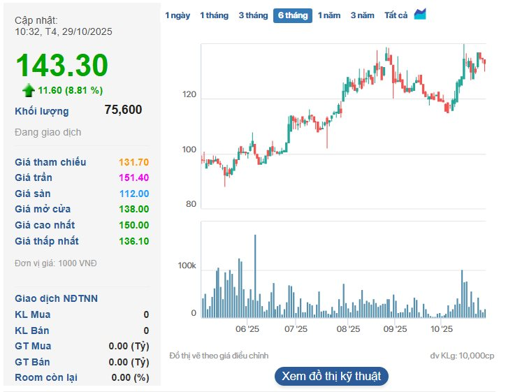 Trong 6 tháng qua, thị giá TOS đã ghi nhận đà tăng trưởng ấn tượng, tăng từ vùng 90.000 đồng (cuối tháng 5/2025) lên 143.300 đồng (phiên sáng 29/10), tương đương mức tăng gần 60%.