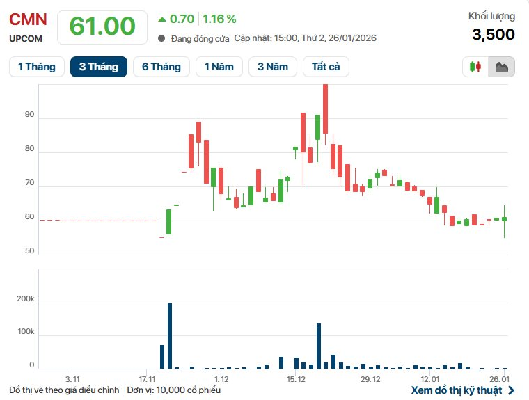 Sau đó, cổ phiếu CMN nhanh chóng điều chỉnh và đến phiên giao dịch ngày 26/01, thị giá còn 61.000 đồng/cổ phiếu.