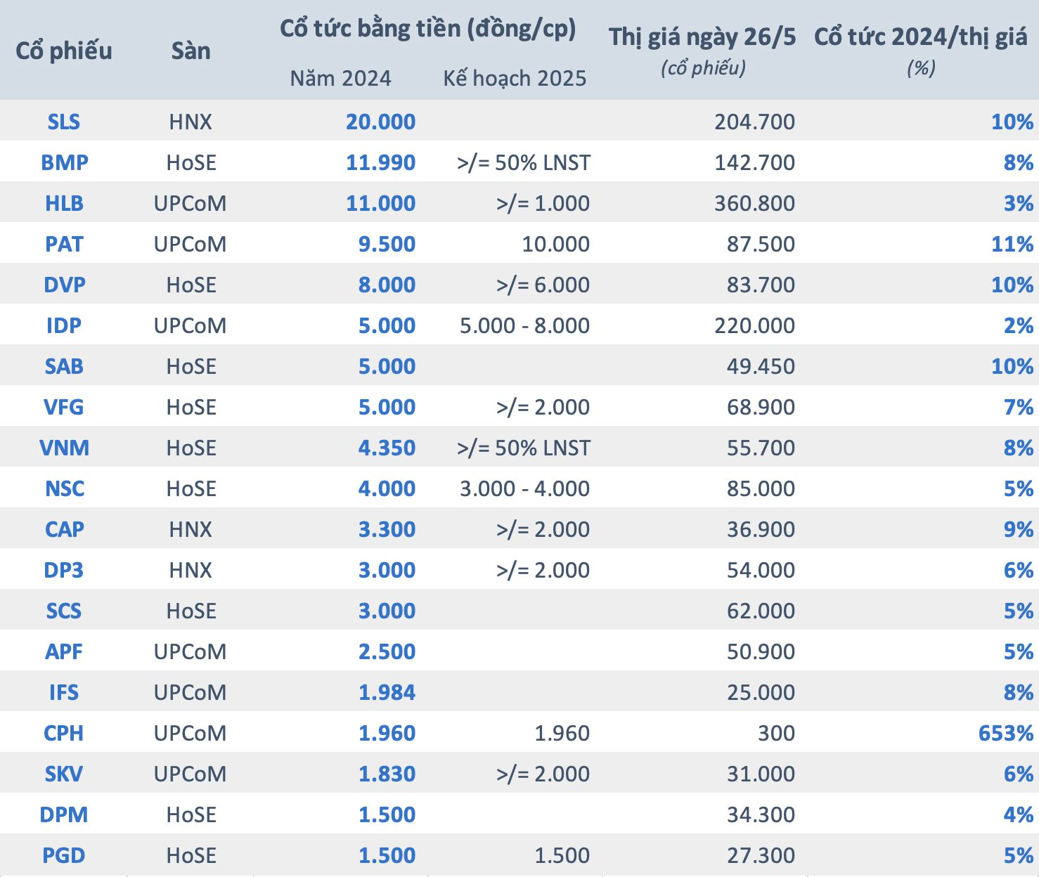 Thống kê sơ bộ dựa trên cổ tức tiền mặt cho năm 2024 và thị giá hiện tại có thể kể ra rất nhiều cái tên cho tỷ suất lợi tức trên 5% như SLS, BMP, PAT, DVP, SAB, VNM, CAP, IFS,… Đặc biệt, có một vài trường hợp như CPH ghi nhận tỷ suất này lên đến hơn 650% do hoạt động chia cổ tức tiền mặt tỷ lệ cao nhiều năm khiến thị giá điều chỉnh chỉ còn 300 đồng.