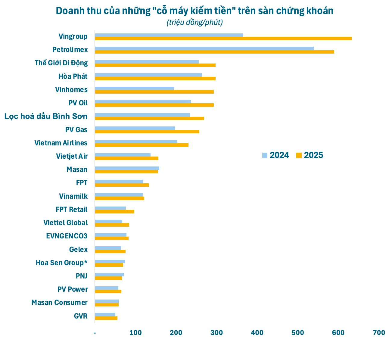 Cú bứt phá ngoạn mục đưa Vingroup soán ngôi Petrolimex (PLX) trở thành quán quân doanh thu năm 2025. Đây là lần đầu tiên “đại gia” bán lẻ xăng dầu lớn nhất cả nước đánh mất vị trí này dù doanh thu cũng đạt kỷ lục. Năm 2025, doanh thu của Petrolimex tăng gần 9% so với cùng kỳ, đạt gần 310.000 tỷ đồng, tương ứng bình quân mỗi phút, kiếm hơn 590 triệu đồng.