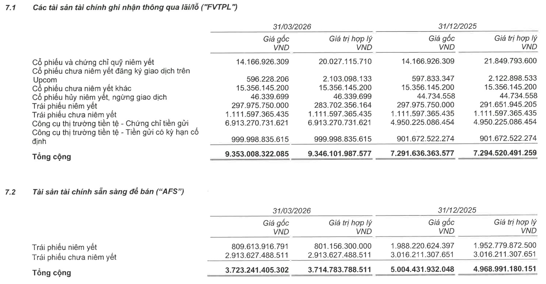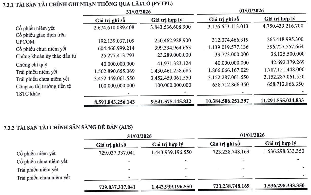 Chứng khoán SHS là một ví dụ điển hình. CTCK này là đơn vị có hoạt động tự doanh khá nổi bật với quy mô danh mục (FVTPL và AFS) thường chiếm khoảng 50-60% tổng tài sản. Tính đến cuối quý 1/2026, giá trị ghi sổ các khoản đầu tư cổ phiếu (niêm yết, UPCoM và chưa niêm yết) đã giảm gần 1.200 tỷ so với đầu năm.