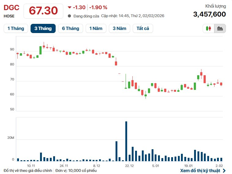 Trên thị trường chứng khoán, cổ phiếu DGC kết phiên 2/2 có giá 67.300 đồng/cp.