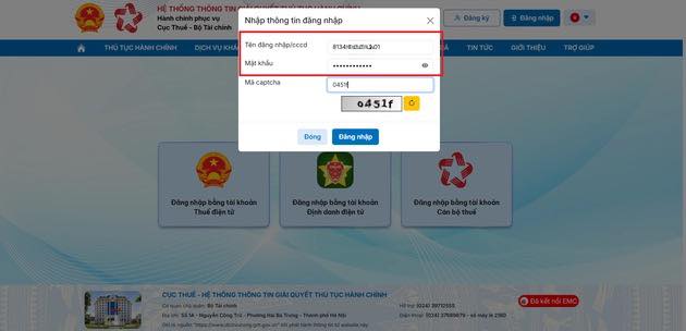 Nhập tên đăng nhập/mật khẩu và mã captcha hiển thị trên màn hình.
