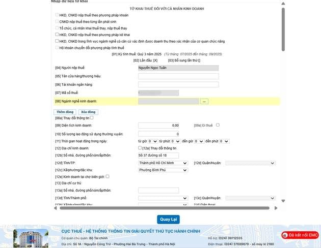 Nhập các trường dữ liệu bắt buộc là “Hình thức kê khai” (ví dụ: Quý) và “Quý kê khai” (ví dụ: Qúy 2 năm 2025).