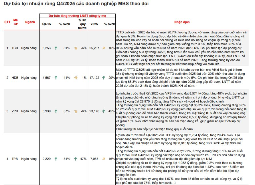 Trong nhóm ngân hàng, MBS dự báo Techcombank (TCB) là ngân hàng có mức tăng trưởng lợi nhuận quý 4/2025 cao nhất trong nhóm theo dõi. Lợi nhuận quý 4ước đạt 6.253 tỷ đồng, tăng 81% so với cùng kỳ, nhờ tín dụng phục hồi cuối năm, NIM ổn định và áp lực trích lập dự phòng giảm.