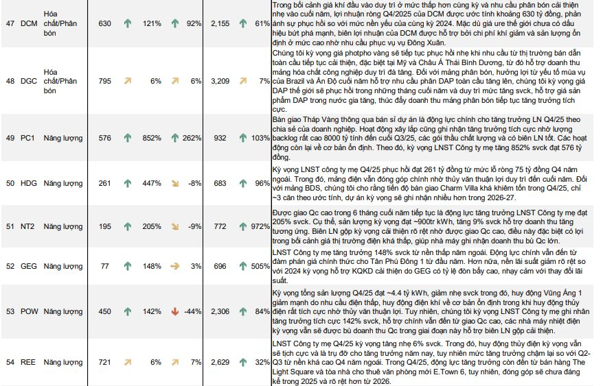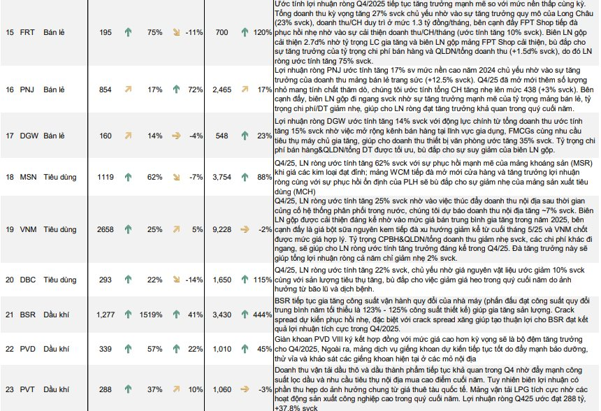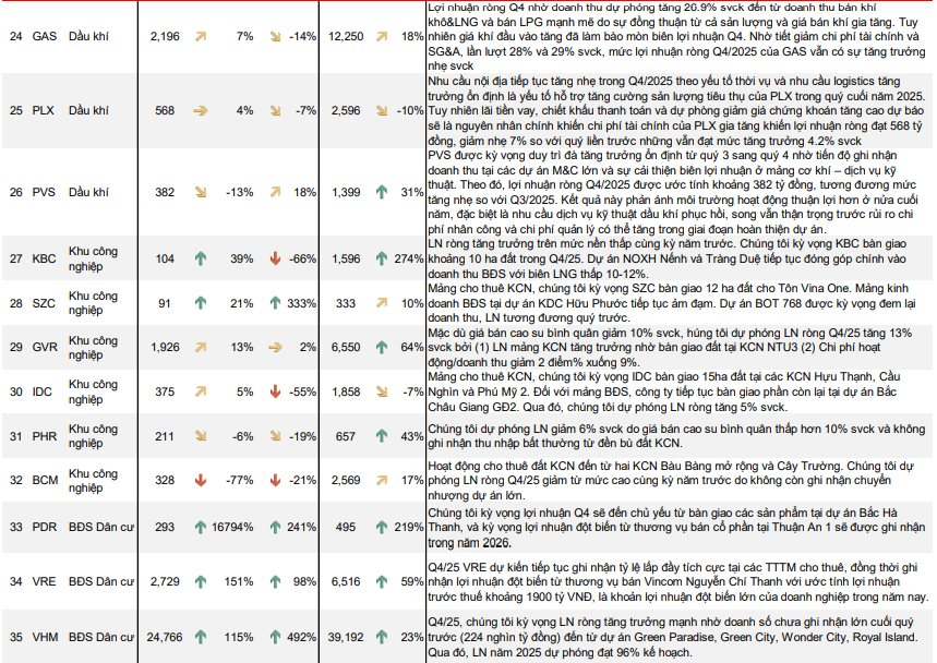 Cụ thể, hàng loạt cổ phiếu dự báo ghi nhận lợi nhuận "tăng bằng lần" trong quý 4/2025 gồm BSR, PDR, VRE, VHM, NKG, DCM, PC1, NT2, POW,... Ngược chiều, nhiều doanh nghiệp sẽ có lợi nhuận tăng trưởng âm trong quý này như ACB, STB, PVS, DBC, BCM, DXG, VTP....