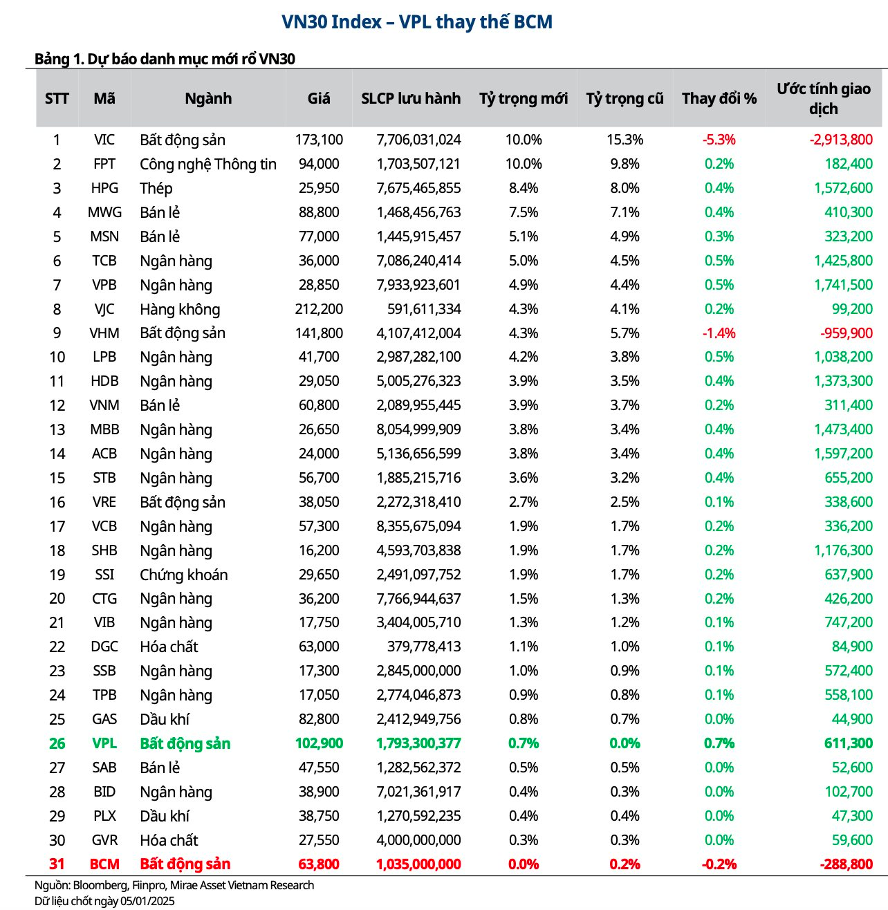 Trong dự báo mới đây, Mirae Asset Securities cho rằng cổ phiếu VPL nhiều khả năng sẽ được bổ sung vào rổ chỉ số VN30 để thay thế BCM trong kỳ điều chỉnh sắp tới. Dựa trên ước tính của Mirae Asset Securities về quy mô vốn hóa, VPL được dự báo sẽ lọt vào Top 20 cổ phiếu có vốn hóa lớn nhất thị trường, trong khi BCM dự kiến bị loại do không đáp ứng tiêu chí duy trì giá trị giao dịch khớp lệnh.
