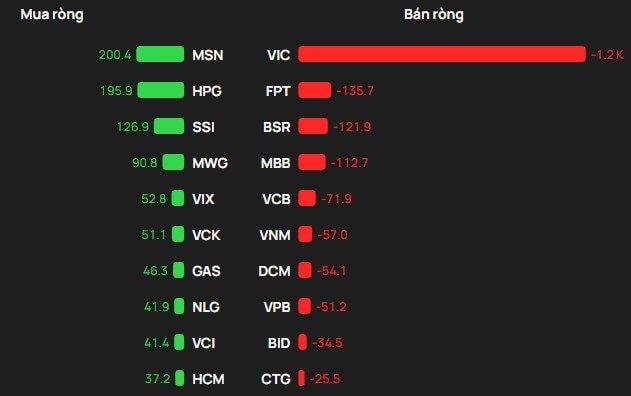 Tại chiều mua, cổ phiếu MSN được khối ngoại mua mạnh nhất trên HOSE với giá trị hơn 200 tỷ đồng. Theo sau, HPG và SSI là mã tiếp theo được gom mạnh 196 tỷ đồng và 127 tỷ đồng.