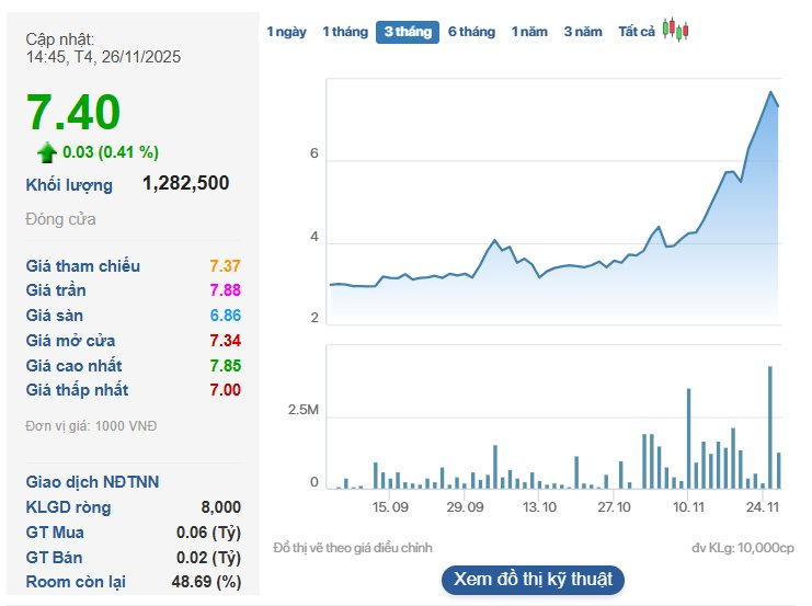 Lũy kế 6 tháng đầu niên độ tài chính 2025, doanh thu thuần đạt 330 tỷ đồng, tăng 94% so với cùng kỳ. Lợi nhuận sau thuế ghi nhận gần 25 tỷ đồng, cải thiện mạnh so với khoản lỗ gần 17 tỷ đồng của cùng kỳ niên độ trước. Phía doanh nghiệp khẳng định mọi diễn biến giá cổ phiếu đều tuân theo quy luật cung cầu tự nhiên.