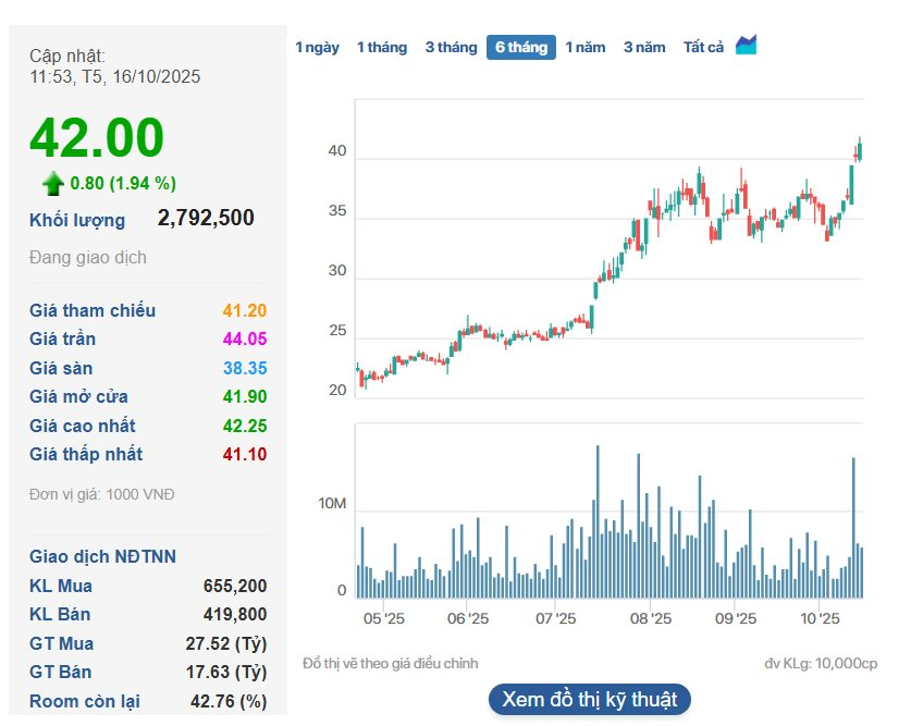 Trên thị trường, cổ phiếu HDC cũng có những diễn biến tích cực. Trong phiên giao dịch ngày 15/10, thị giá HDC giao dịch quanh mức 41.100 - 42.250 đồng/cổ phiếu. So với vùng đáy hồi giữa tháng 4/2025, cổ phiếu này đã tăng gần 90% giá trị.