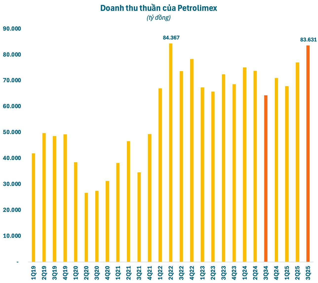 Theo báo cáo tài chính quý 3/2025, Tập đoàn Xăng dầu Việt Nam (mã PLX) ghi nhận doanh thu thuần đạt 83.631 tỷ đồng, tăng 30% so với cùng kỳ 2024. Đây là mức doanh thu cao thứ 2 trong lịch sử hoạt động của doanh nghiệp bán lẻ xăng dầu này, chỉ kém đôi chút so với mức kỷ lục đạt được vào quý 1/2022.