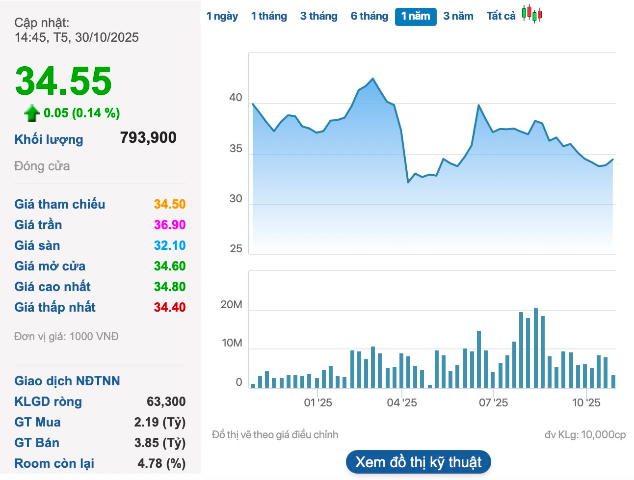 Trên sàn chứng khoán, cổ phiếu PLX đóng cửa phiên 30/10 ở mức 34.550 đồng/cp, giảm gần 5% so với đầu năm. Vốn hóa thị trường tương ứng đạt xấp xỉ 44.000 tỷ đồng.