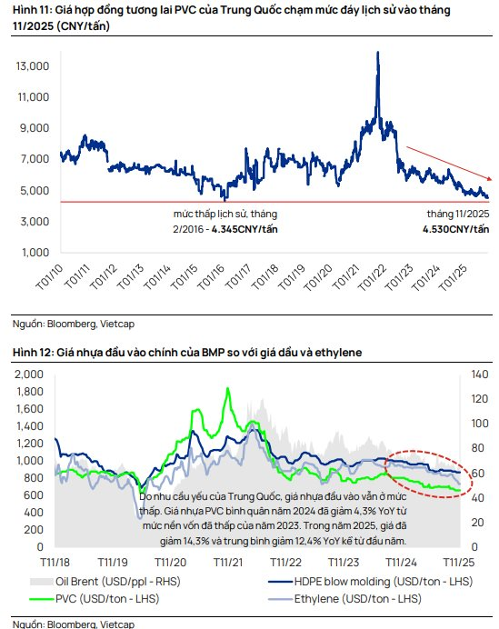 Do đó, nhóm phân tích điều chỉnh giả định sang việc nguồn cung PVC sẽ không bị cắt giảm đáng kể. Ở chiều cầu, nhu cầu xây dựng nội địa Trung Quốc đã giảm hơn 3 năm liên tiếp và tiếp tục yếu trong các tháng gần đây; xuất khẩu PVC cũng chịu rủi ro từ thuế chống bán phá giá mà Ấn Độ sắp áp dụng. Những yếu tố này khiến Vietcap duy trì quan điểm kém tích cực đối với giá PVC, đồng nghĩa triển vọng biên lợi nhuận của BMP trở nên "sáng" hơn.