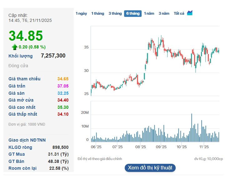 Đáng chú ý, động thái chuyển dịch tài sản này diễn ra trong bối cảnh cổ phiếu KDH đang có diễn biến tích cực trên thị trường chứng khoán. Kết thúc phiên giao dịch ngày 21/11/2025, thị giá KDH đóng cửa tại mốc 34.850 đồng/cổ phiếu, tăng nhẹ 0,58% so với tham chiếu với thanh khoản sôi động đạt hơn 7,2 triệu đơn vị được sang tay.