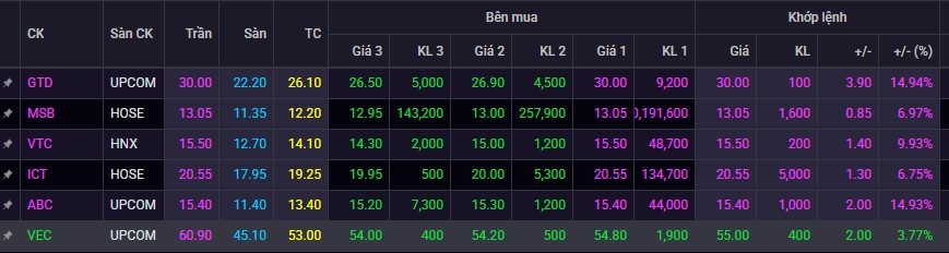 Tương tự, cổ phiếu VTC của CTCP Viễn thông VTC (VTC Telecom) cũng tăng hết biên độ lên 15.500 đồng/cp trong phiên 27/11, đánh dấu phiên tăng trần thứ 7 liên tiếp. Đà tăng xuất hiện sau khi Tập đoàn Bưu chính Viễn thông Việt Nam (VNPT) thông báo về việc muốn đấu giá cả lô cổ phần gồm hơn 2,1 triệu cổ phiếu (tương ứng 46,67% tổng số cổ phần đã phát hành theo vốn thực góp trong vốn điều lệ của VTC Telecom). Tổng giá khởi điểm hơn 104 tỷ đồng, tương ứng 49.200 đồng/cp, cao hơn khoảng 4,5 lần so với thị giá hiện tại.
