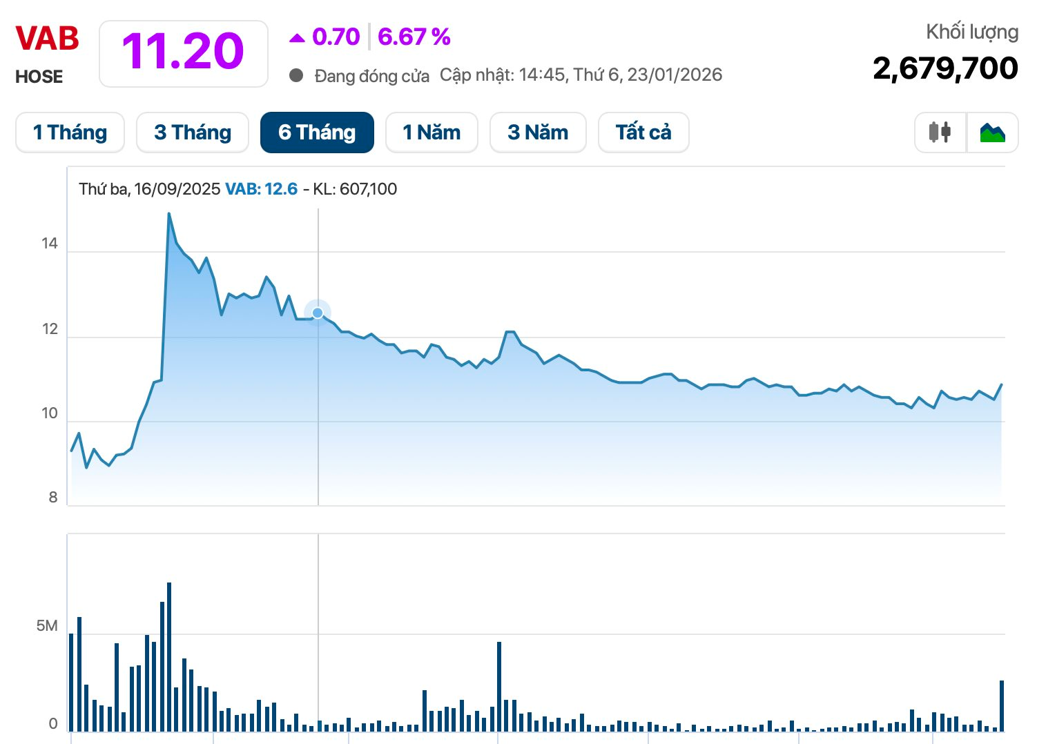 Kết phiên 23/1, VAB bật tăng kịch trần lên 11.200 đồng/cổ phiếu. Thanh khoản cũng bùng nổ với khoảng 2,6 triệu cổ phiếu được sang tay, cao gấp nhiều lần mức bình quân các phiên trước đó.