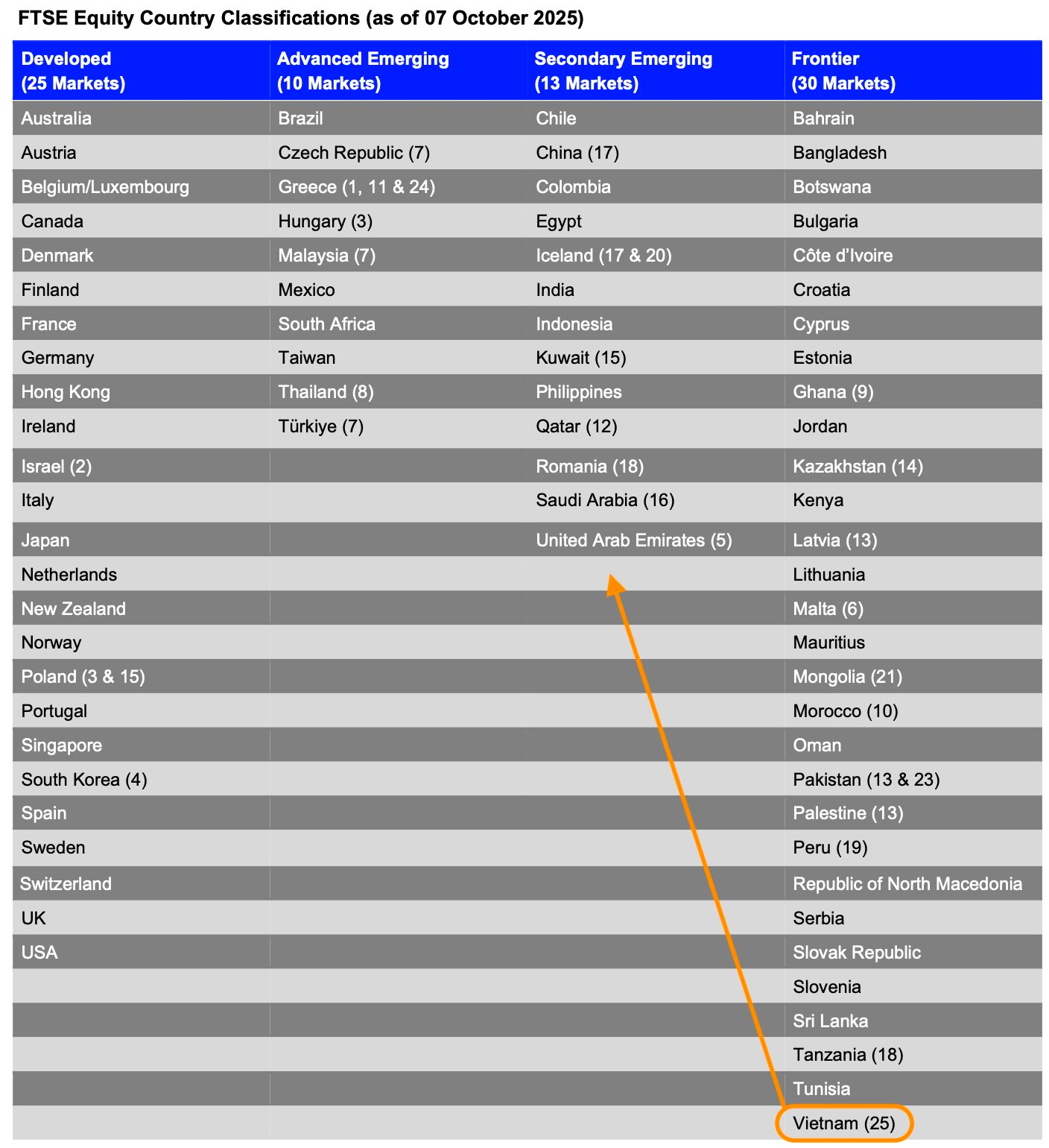 Đồng quan điểm, báo cáo chiến lược mới đây của SSI Research cũng cho rằng Việt Nam đang đi đúng hướng để được FTSE nâng hạng lên thị trường mới nổi vào năm 2026. Ước tính dòng vốn thụ động khoảng 1,67 tỷ USD từ các quỹ ETF toàn cầu sẽ đổ vào thị trường. Nếu vượt qua kỳ đánh giá lần này, thị trường có thể bắt đầu thu hút dòng vốn này từ tháng 9/2026.