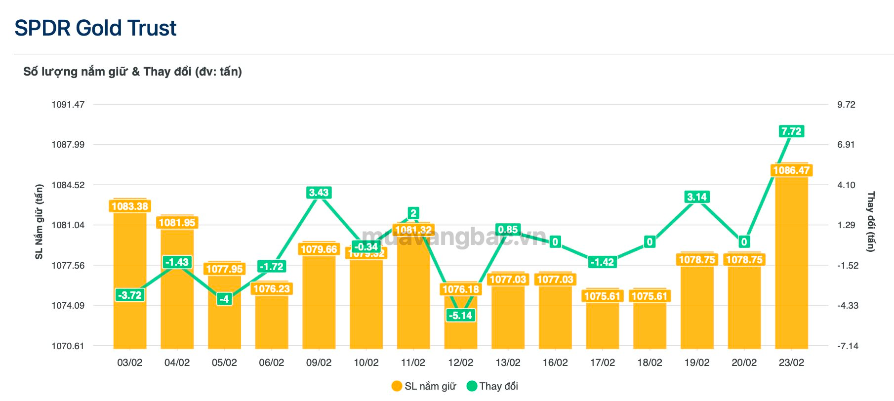 Theo dữ liệu thống kê mới nhất từ Muavangbac.vn, quỹ vàng lớn nhất thế giới SPDR Gold Trust đã mua ròng 7,72 tấn vàng trong phiên 24/2, qua đó nâng tổng khối lượng nắm giữ lên 1.086,47 tấn. Trước đó, quỹ này cũng duy trì trạng thái gom ròng trong tuần giao dịch liền kề.