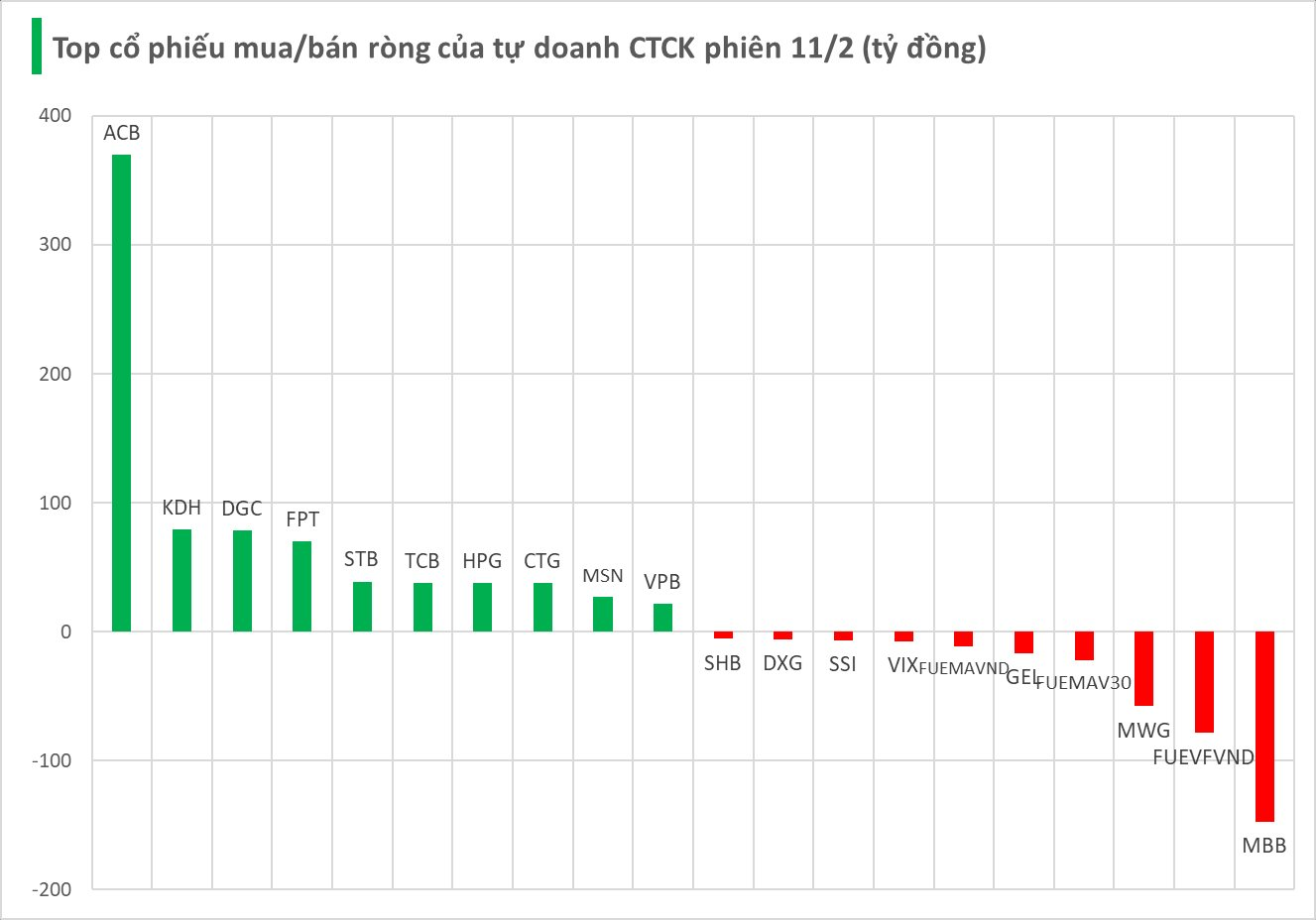 Cụ thể, ACB được mua ròng mạnh nhất với giá trị 370 tỷ đồng. Theo sau là KDH và DGC cùng đạt 79 tỷ, FPT (70 tỷ), STB (39 tỷ), TCB (38 tỷ), HPG (38 tỷ), CTG (37 tỷ), MSN (27 tỷ) và VPB (22 tỷ đồng) đều được tự doanh CTCK mua tích cực.